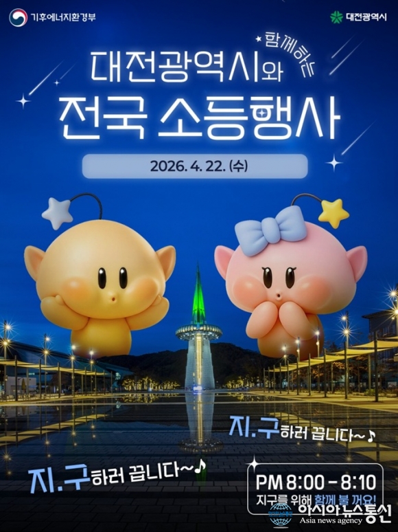 대전시 소등행사 안내 포스터./사진제공=대전시 [아시아뉴스통신=박희석 기자] 대전시는 제56주년 지구의 날을 맞아 20일부터 25일까지 ‘탄소중립 실천으로 세상을 잇다, 지구는 녹색대전환 중’을 슬로건으로 기후변화주간을 운영하고 22일 저녁에는 소등행사를 실시한다. 이번 기후변화주간은 기후위기.. 2026-04-20