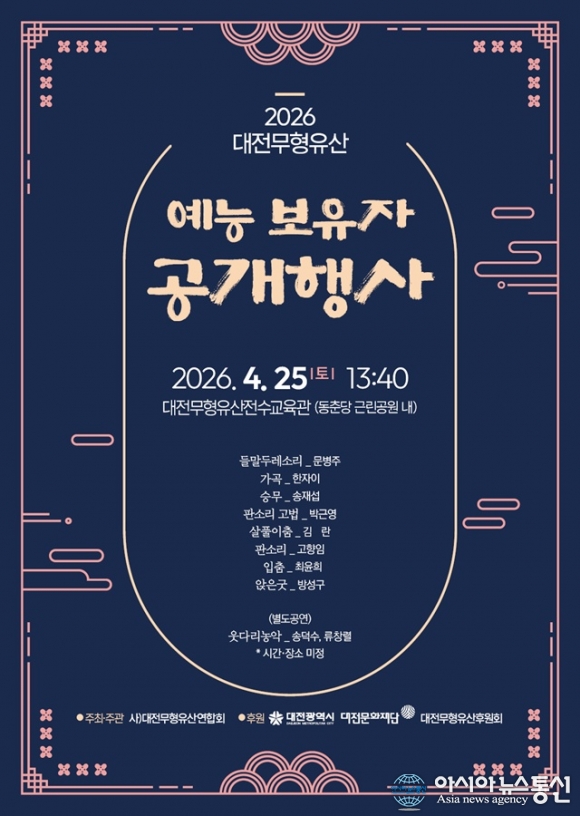 2026 대전무형유산 예능보유자 공개행사 포스터./사진제공=대전문화재단 [아시아뉴스통신=박희석 기자] 대전시의 무형유산의 가치를 시민과 함께 나누기 위해 오는 25일 대전무형유산전수교육관에서 ‘2026년 대전무형유산 예능보유자 공개행사’를 개최한다. 대전시 무형유산의 전승·보존의 대중화.. 2026-04-20