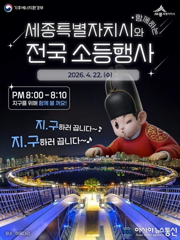 지구의 날 소등행사 포스터./사진제공=세종시 [아시아뉴스통신=박희석 기자] 세종시가 20일부터 25일까지 6일간 중앙공원 일대에서 ‘제18회 기후변화주간’ 행사를 개최한다. 4월 22일 ‘제56주년 지구의 날’을 맞아 열리는 기후변화주간은 ‘시민들이 함께 실천하는 탄소중립’을 주제로 기.. 2026-04-20