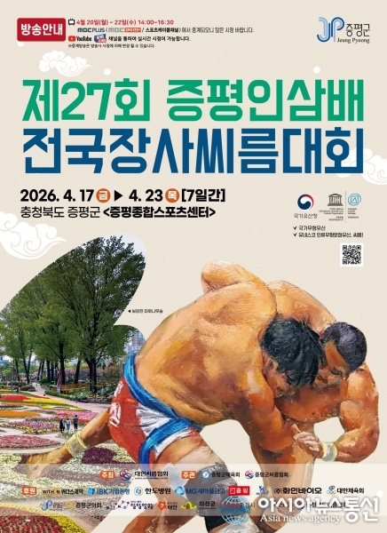 제27회 증평인삼배 전국장사씨름대회 포스터./사진제공=증평군청 [아시아뉴스통신=장하영 기자] 충북 증평군이 오는 17일부터 23일까지 7일간 증평종합스포츠센터에서 ‘제27회 증평인삼배 전국장사씨름대회’를 개최한다. 이번 대회는 (사)대한씨름협회가 주최하고 증평군체육회와 증평군씨름협회가 .. 2026-04-14