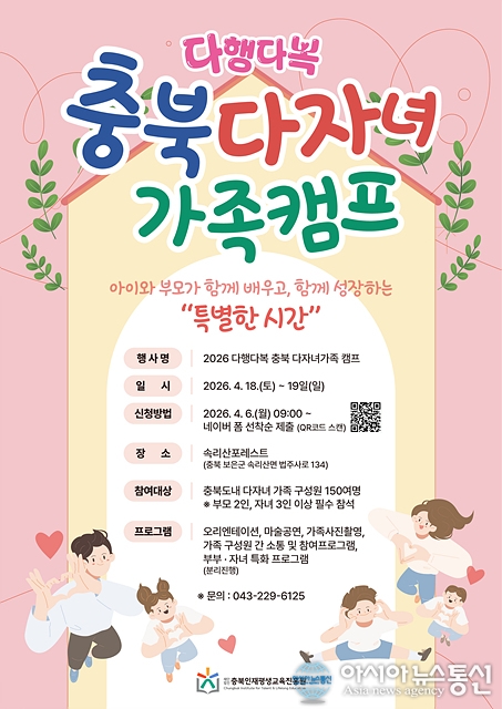 2026년 충북 다자녀가족 캠프 포스터./사진제공=충북도청 [아시아뉴스통신=장하영 기자] 충북인재평생교육진흥원(이하 인평원)은 도내 다자녀가족을 대상으 로 가족 간 소통과 유대 강화를 위한 「2026년 충북 다자녀가족 캠프」 참가자를 모집한다고 밝혔다. 이번 캠프는 충청북도 11개 시·군에 거주하는 .. 2026-04-06