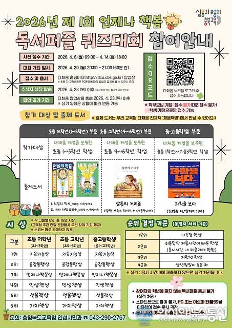 2026년 제1회 언제나 책봄 독서퍼즐 퀴즈대회 홍보물./사진제공=충북교육청 [아시아뉴스통신=장하영 기자] 충청북도교육청(교육감 윤건영)은 학생들의 독서 흥미를 높이고 자기주도적 독서문화를 확산하기 위해 20일(월), <2026년 제1회 언제나 책봄 독서퍼즐 퀴즈대회>를 개최한다고 밝혔다. 이번 대회는 학생.. 2026-04-06