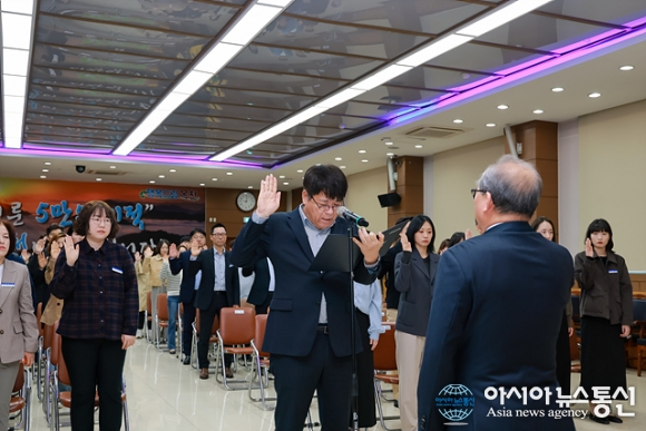 친절행정 실천 결의대회./사진제공=옥천군청 [아시아뉴스통신=장하영 기자] 4월 1일 군청 대회의실에서 열린 옥천군 직원조회에 100여명의 공직자가 참석한 가운데 ‘친절행정 실천 결의대회’를 가졌다고 밝혔다. 이번 결의대회는 군민의 행복을 책임지는 옥천군 공직자들이 군민에게 더욱 신뢰받고 사.. 2026-04-01