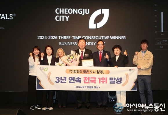 기업하기 좋은 도시 3년 연속 전국 1위 달성(왼쪽 세번째부터 엘런 스미스(Allen Smyth) 뉴욕페스티벌 CEO, 이범석 청주시장, 윤은기 뉴욕페스티벌 한국위원장)./사진제공=청주시청 [아시아뉴스통신=장하영 기자] 청주시는 지난 2일 서울 롯데호텔 크리스탈볼룸에서 열린 ‘제17회 뉴욕페스티벌 대한민국-국가브랜.. 2026-04-03