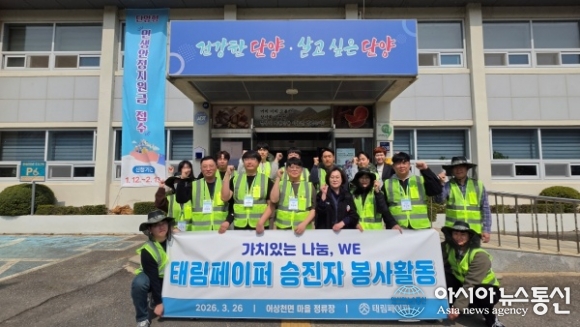 ㈜태림페이퍼, 어상천면 환경정화 봉사활동./사진제공=단양군청 [아시아뉴스통신=장하영 기자] ㈜태림페이퍼는 지난 26일 단양군 어상천면을 찾아 지역 환경개선을 위한 봉사활동을 실시했다. 이날 봉사활동에는 임직원 15명이 참여해 주민들이 자주 이용하는 버스 승강장 청소를 비롯해 도로변 환경정화 활동.. 2026-03-30