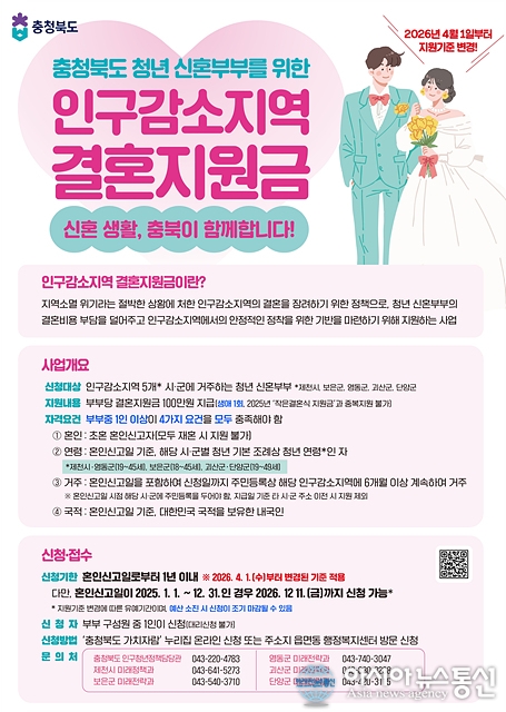 인구감소지역 결혼지원금 포스터./사진제공=충북도청 [아시아뉴스통신=장하영 기자] 충북도는 도내 인구감소지역 청년 신혼부부의 안정적인 지역 정착을 지원하기 위해 추진 중인 ‘인구감소지역 결혼지원금’ 사업을 오는 4월 1일부터 전격 개편 시행한다. 이번 사업은 도내 인구감소지역*인 제천시, .. 2026-03-31