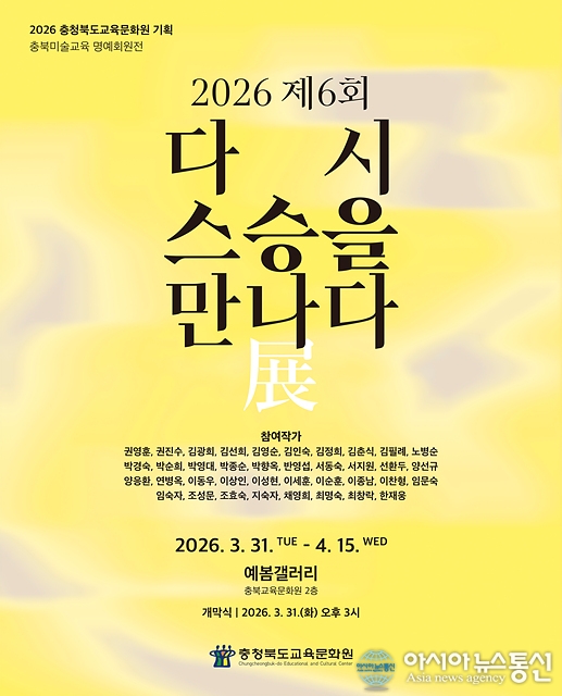 <다시 스승을 만나다>전(展) 포스터./사진제공=충북교육청 [아시아뉴스통신=장하영 기자] 충청북도교육청 직속기관 교육문화원(원장 서종덕)은 31일(화)부터 4월 15일(수)까지 교육문화원 2층 예봄갤러리에서 퇴임 미술교원의 창작 작품을 한자리에서 만날 수 있는 <다시 스승을 만나다>전(展)을 개최한다... 2026-03-31