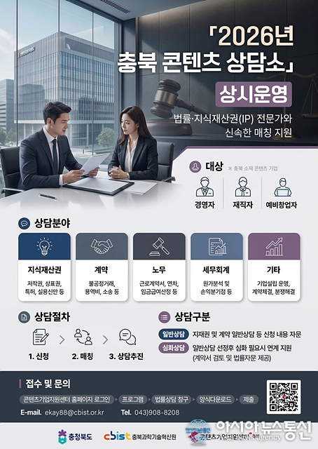 충북 콘텐츠 상담소 홍보./사진제공=충북도청 [아시아뉴스통신=장하영 기자] 충북과학기술혁신원(원장 고근석)이 운영하는 충북콘텐츠기업지원센터는 도내 콘텐츠 기업 및 창작자의 법률 애로 해소를 위해 ‘충북 콘텐츠 상담소’를 3월 23일부터 상시 공고한다고 밝혔다. 이번 사업은 2025년 사업에 이어.. 2026-03-31