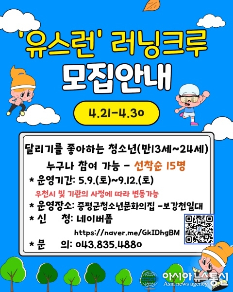 증평군청소년문화의집, 청소년 주도 ‘유스런 러닝크루’ 모집 포스터./사진제공=증평군청 [아시아뉴스통신=장하영 기자] 충북 증평군청소년문화의집이 청소년들이 직접 기획하고 운영하는 주도형 러닝크루 ‘유스런 러닝크루’를 모집한다. 이번 프로그램은 청소년들이 건강한 스포츠 문화를 .. 2026-04-20