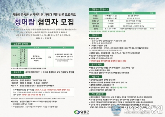 제8회 영동군 난계국악단 차세대 명인 발굴 프로젝트 ‘청어람’ 접수./사진제공=영동군청 [아시아뉴스통신=장하영 기자] 충북 영동군은 제8회 난계국악단 차세대 명인 발굴 프로젝트 ‘청어람’ 신청을 4월 3일까지 접수한다고 밝혔다. 청어람은 난계 박연의 예술적 정신을 계승하고 있는 영동.. 2026-03-18