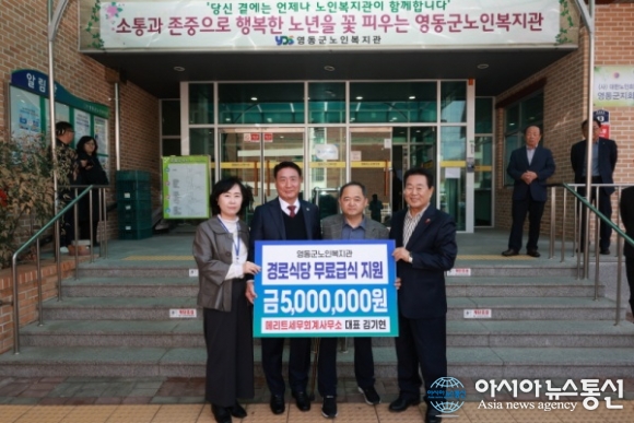 메리트세무회계사무소, 영동군노인복지관에 후원금 500만 원 전달./사진제공=영동군청 [아시아뉴스통신=장하영 기자] 충북 영동군 영동읍 메리트세무회계사무소(대표 김기현)는 지난 17일, 영동군노인복지관을 찾아 지역 어르신들을 위해 무료급식에 사용해 달라며 후원금 500만 원을 전달했다. 후원금은 평.. 2026-03-18