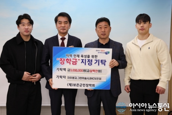보은군민장학회, 부자와 사위가 함께 장학금 기탁./사진제공=보은군청 [아시아뉴스통신=장하영 기자] 충북 보은군은 지난 17일 자유광고, 그린미술사, BHC보은점이 지역 인재 육성을 위한 장학금 300만 원을 보은군민장학회(이사장 최재형)에 기탁했다고 밝혔다. 이날 기탁식에는 자유광고 박용수 대표와 아들.. 2026-03-18