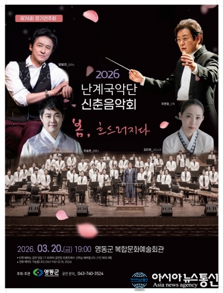 제74회 정기연주회 영동군 난계국악단 신춘음악회 개최./사진제공=영동군청 [아시아뉴스통신=장하영 기자] 충북 영동군은 제74회 정기연주회 ‘난계국악단 신춘음악회’를 개최한다고 밝혔다. ‘신춘음악회’는 새봄의 시작과 함께 생동감 있는 에너지를 담아, 난계국악단의 다채롭고 품격 있는 .. 2026-03-17