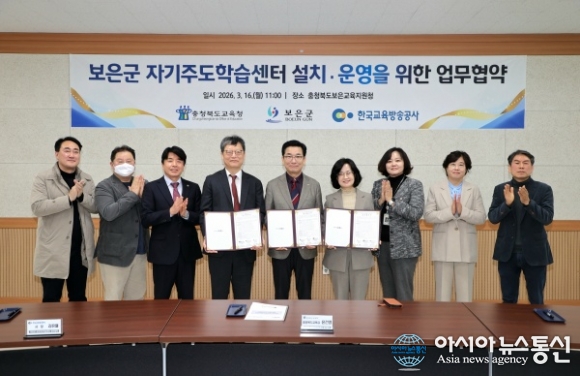 보은군, 충북교육청·EBS와 보은군 자기주도학습센터 설치·운영 업무협약 체결./사진제공=보은군청 [아시아뉴스통신=장하영 기자] 충북 보은군은 지난 16일 보은교육지원청에서 충청북도교육청(교육감 윤건영), 한국교육방송공사(EBS)와 보은군 자기주도학습센터 설치·운영을 위한 업무협약을 체.. 2026-03-17