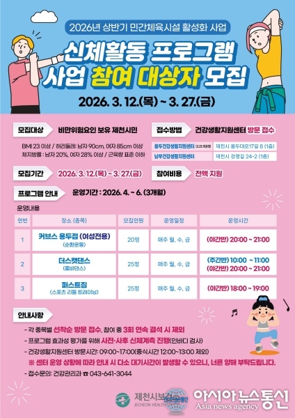 제천시보건소, 체육시설 연계 비만예방 프로그램 참여자 모집 포스터./사진제공=제천시청 [아시아뉴스통신=장하영 기자] 제천시보건소는 비만을 예방하고 규칙적인 운동 습관을 형성하기 위한 민간체육시설 연계 신체활동 프로그램 참여자를 오는 27일까지 모집한다. 이번 사업은 체질량지수(BMI) 23이상, 근.. 2026-03-17