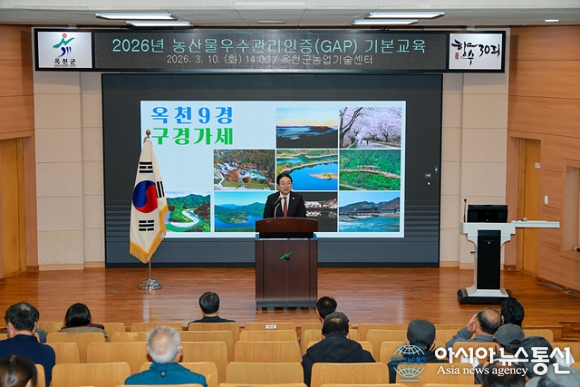 농산물우수관리(GAP) 인증 기본교육./사진제공=옥천군청 [아시아뉴스통신=장하영 기자] 옥천군이 농업기술센터 농업인교육관에서 포도·복숭아 등 지역 대표 과수 재배 농가 130여 명을 대상으로 ‘농산물우수관리(GAP) 인증 기본교육’을 실시하며 농업 경쟁력 강화에 박차를 가했다. 이번 교육은 농.. 2026-03-11