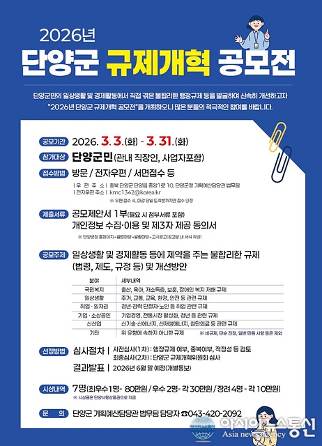 2026년 단양군 규제개혁 공모전 포스터./사진제공=단양군청 [아시아뉴스통신=장하영 기자] 단양군이 군민의 일상생활과 경제활동에서 체감하는 불합리한 행정규제를 발굴하고 개선하기 위해 ‘2026년 단양군 규제개혁 공모전’을 개최한다. 이번 공모전은 군민의 다양한 의견을 수렴해 현실에 맞지 않거나 .. 2026-03-11