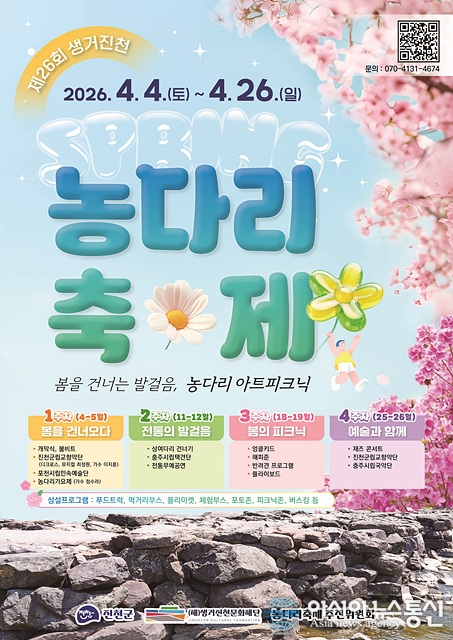 제26회생거진천농다리축제 안내 포스터./사진제공=진천군청 [아시아뉴스통신=장하영 기자] 충북 진천군의 대표 봄 축제인 ‘제26회 생거진천 농다리 축제’가 오는 4월 4일부터 4월 26일까지 문백면 농다리 일원에서 열린다. 생거진천 문화재단이 주관하는 이번 축제는 한 달 동안 매주 토요 일과 일요일마.. 2026-03-11