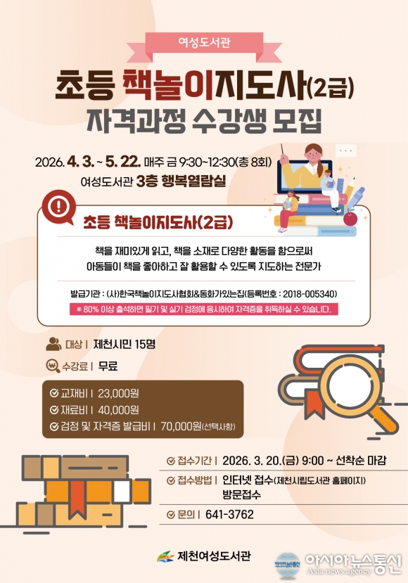 초등 책놀이지도사 자격 과정 수강생 모집 포스터./사진제공=제천시청 [아시아뉴스통신=장하영 기자] 제천여성도서관이 오는 4월부터 「초등 책놀이지도사 자격과정」을 운영한다. ‘초등 책놀이지도사’는 책을 재미있게 읽고 스토리텔링을 통해 아이들의 상상력과 창의력을 키우며, 책 놀이 활동을 .. 2026-03-10