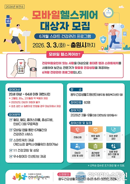 2026 모바일 헬스케어 참여자 모집 홍보물./사진제공=제천시청 [아시아뉴스통신=장하영 기자] 제천시보건소는 지역 주민의 자가 건강관리 능력 향상과 만성질환 예방을 위해 용두건강생활지원센터에서 진행하는 ‘2026 모바일 헬스케어 사업’ 신규 참여자 60명을 선착순으로 모집한다. 모바일 헬스케어사.. 2026-03-05