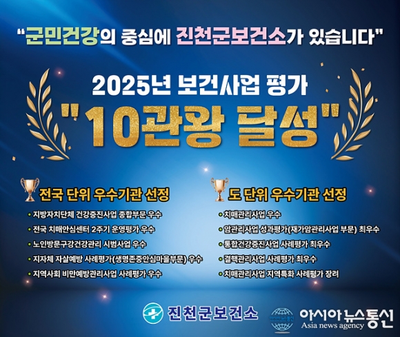 2025년 진천군 보건사업 성과./사진제공=진천군청 [아시아뉴스통신=장하영 기자] 충북 진천군이 전 세대를 아우르는 종합 보건의료 정책을 본격 추 진한다. 군은 지난해 탄탄한 공중보건의료 정책으로 국가, 도 단위 각종 평 가에서 10개 분야 최우수·우수기관으로 선정된 데 이어, 올해도 영 유아부터 65세 .. 2026-03-05