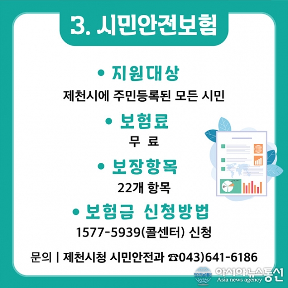 2026년 시민안전보험 갱신 운영./사진제공=제천시청 [아시아뉴스통신=장하영 기자] 제천시는 예기치 못한 사고와 재난으로 피해를 입은 시민들의 생활 안정과 일상 회복을 지원하기 위한 시민안전보험을 전년도와 동일한 조건으로 올해도 갱신해 운영한다고 밝혔다. 시민안전보험은 제천시에 주민등록을 둔 모.. 2026-03-05
