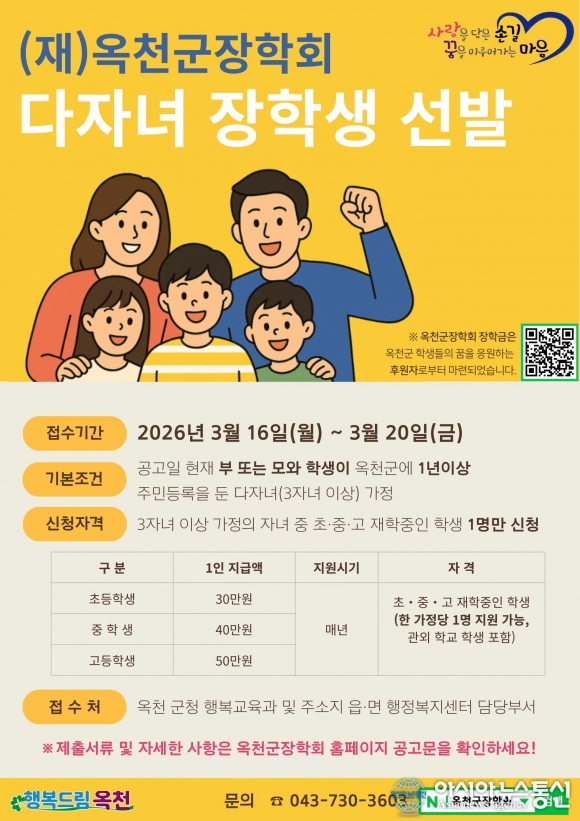 2026년 다자녀 장학금 포스터./사진제공=옥천군청 [아시아뉴스통신=장하영 기자] 옥천군은 다자녀 가정의 교육 기회를 확대하고 학업지원을 강화하기 위해 2026년 다자녀 장학금 신청을 받는다고 밝혔다. 다자녀 장학금은 2025년 신설된 사업으로, 다자녀 가구의 경제적 부담을 덜고 인구감소 및 저출산 문제에 대.. 2026-03-05