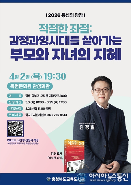 교육도서관, 김경일 교수 초청<통섭의 광장> 인문 강연 홍보물./사진제공=충북교육청 [아시아뉴스통신=장하영 기자] 충청북도교육청 직속기관 교육도서관(관장 노재경)은 학생과 학부모, 교직원, 지역주민이 함께 삶의 지혜와 인문학적 통찰을 나누는 프리미엄 인문 강연 <통섭의 광장>을 운영한다고 밝.. 2026-03-06