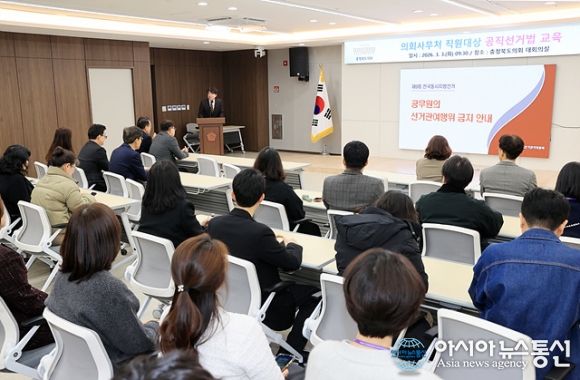 사무처 직원을 대상으로 지방선거 대비 공직선거법 교육./사진제공=충북도의회 [아시아뉴스통신=장하영 기자] 충북도의회(의장 이양섭)는 3일 도의회 대회의실에서 사무처 직원을 대상으로 지방선거 대비 공직선거법 교육을 실시했다. 이번 교육은 제9회 전국동시지방선거를 앞두고 공무원의 정치적 중립 의무.. 2026-03-04