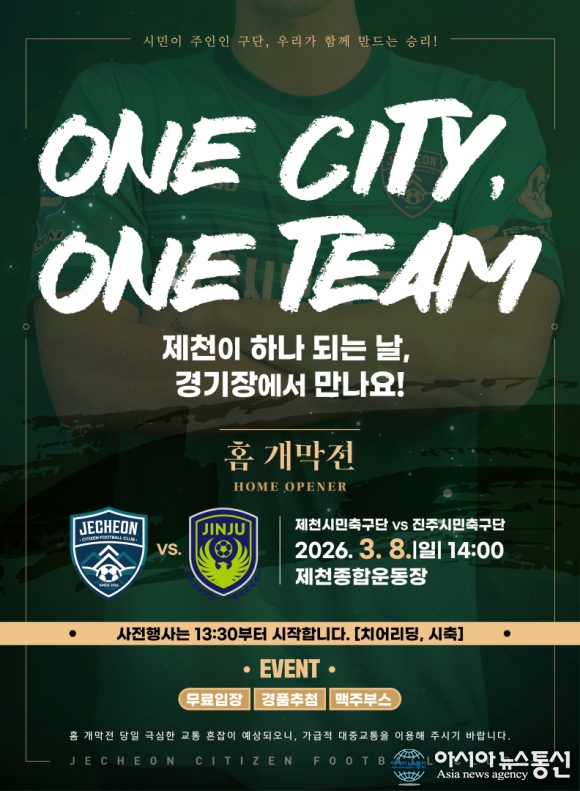 제천시민축구단 개막전 포스터./사진제공=제천시청 [아시아뉴스통신=장하영 기자] 제천시민축구단이 오는 3월 8일 오후 2시, 제천종합운동장에서 역사적인 홈 개막전을 연다. 이번 경기는 제천시민축구단이 대한축구협회 K4리그 참가 승인 이후 치르는 첫 경기이자 창단 이후 시민들에게 처음 선보이는 공식 홈.. 2026-03-04