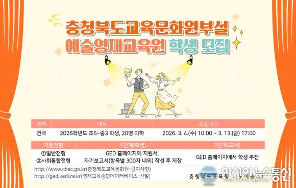 교육문화원부설예술영재교육원, 2026학년도 연극 영재 모집 홍보물./사진제공=충북교육청 [아시아뉴스통신=장하영 기자] 충청북도교육청 직속기관 교육문화원(원장 서종덕)부설예술영재교육원(이하 예술영재교육원)은 4일(수), 연극을 통해 예술적 재능을 키울 2026학년도 신입생을 모집한다고 밝혔다. 예술영재.. 2026-03-04