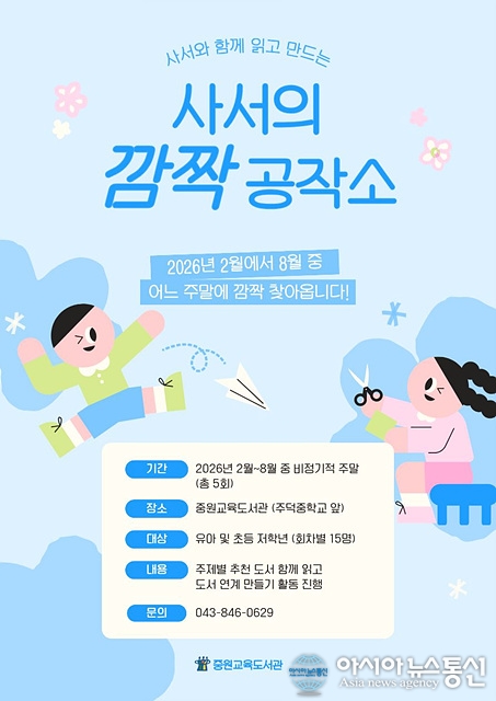 사서의 깜짝 공작소 홍보물./사진제공=충북교육청 [아시아뉴스통신=장하영 기자] 충청북도교육청 직속기관 중원교육문화원(원장 신기철)은 오는 28일(토)부터 8월 말까지 유아 및 초등 저학년을 대상으로 토요일 프로그램 <사서의 깜짝 공작소>를 총 5회 운영한다고 밝혔다. <사서의 깜짝 공작소>는 담당 .. 2026-02-27