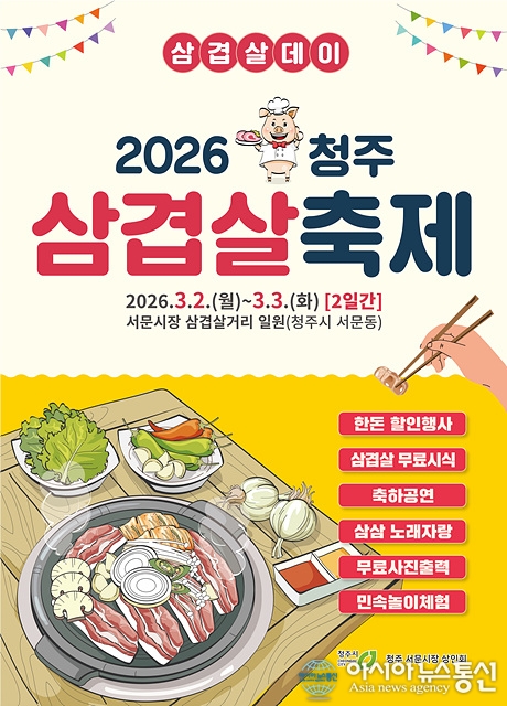 2026년 3·3데이 청주 삼겹살 축제 포스터./사진제공=청주시청 [아시아뉴스통신=장하영 기자] 청주시는 지역 유일 음식특화거리인 상당구 서문시장 삼겹살거리를 알리기 위해 ‘2026년 3·3데이 청주 삼겹살 축제’를 오는 3월 2일부터 3일까지 삼겹살거리 일원에서 개최한다. 서문시장 상인회(회장 .. 2026-02-27