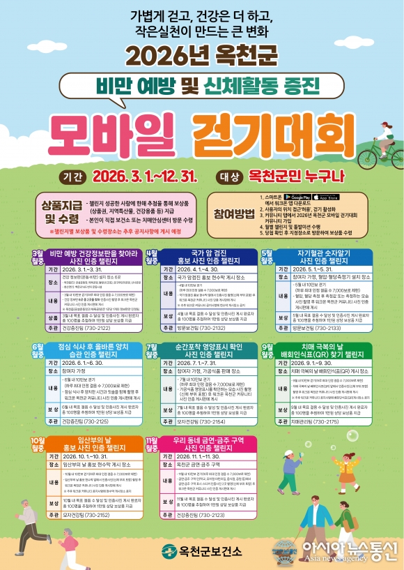 2026년 옥천군 모바일 걷기대회 홍보물./사진제공=옥천군청 [아시아뉴스통신=장하영 기자] 옥천군보건소는 지역주민의 일상 속 걷기 실천율을 높이고 건강증진을 도모하기 위해 ‘2026년 옥천군 모바일 걷기대회’ 커뮤니티를 운영한다고 밝혔다. 이번 걷기대회는 모바일 걷기 플랫폼 워크온을 활용해 비.. 2026-02-27
