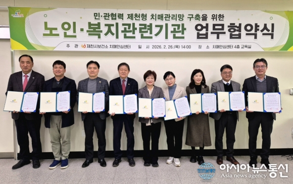 민관협력 제천형 치매관리망 구축을 위한 업무협약식./사진제공=제천시청 [아시아뉴스통신=장하영 기자] 제천시보건소(소장 안순덕)는 지난 26일 관내 복지 및 노인 관련 기관과 ‘민관협력 제천형 치매관리망’ 구축을 위한 업무협약을 체결했다. 제천시는 그동안 ‘치매로부터 더 자유롭고 안심되.. 2026-02-27