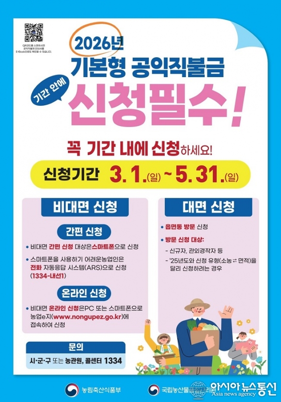 2026년 기본형 공익직불금 홍보물./사진제공=제천시청 [아시아뉴스통신=장하영 기자] 제천시는 2026년 ‘기본형 공익직불금’ 신청을 3월 1일부터 5월 31일까지 접수한다. 올해는 비대면 신청과 읍면동 방문 신청 기간을 통합해 운영한다. 농업경영체 등록 정보에 변동이 없고, 자격요건 사전 검증에서 적격.. 2026-02-27