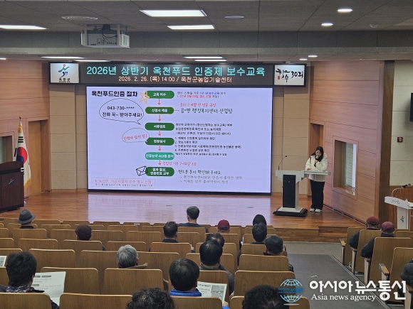 상반기 옥천푸드 인증제 보수교육./사진제공=옥천군청 [아시아뉴스통신=장하영 기자] 옥천군은 지난 26일 옥천푸드인증제 보수교육을 120여 개 인증 농가가 참여한 가운데 성황리에 마쳤다고 밝혔다. 이번 교육은 「옥천푸드 육성 및 지원에 관한 조례」에 따라 연 2회(상·하반기) 운영되는 정기 보수교육.. 2026-02-27