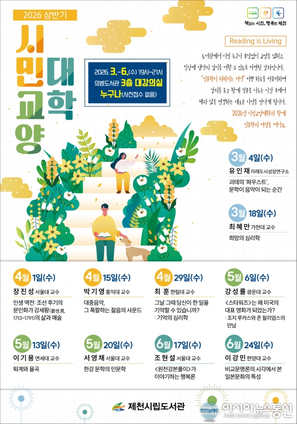 2026 상반기시민교양대학 포스터./사진제공=제천시청 [아시아뉴스통신=장하영 기자] 제천시립도서관은 시민이 일상에서 인문학을 쉽게 접하고 삶을 성찰할 수 있도록「2026 상반기 시민교양대학」을 운영한다. 이번 시민교양대학은 3월부터 6월까지 총 10회에 걸쳐 수요일 오후 7시부터 9시까지 의병도서관 3층 .. 2026-02-25