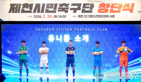 제천시민축구단 창단식./사진제공=제천시청 [아시아뉴스통신=장하영 기자] 제천시민축구단이 지난 24일, 제천더그랜드컨벤션센터에서 창단식을 개최하고 2026시즌 K4리그 참가를 향한 공식 출범을 선언했다. 이날 행사에는 김창규 제천시장(구단주), 박영기 제천시의회 의장을 비롯해 충청북도체육회와 축구협.. 2026-02-25