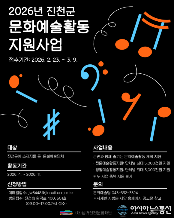 진천 문화예술활동 지원사업 공모 포스터./사진제공=진천군청 [아시아뉴스통신=장하영 기자] (재)생거진천문화재단은 지역 문화예술인의 자생력을 강화하고 군민 의 문화 향유 기회를 확대하기 위해 ‘2026년도 진천군 문화예술활동 지원사업’ 참여 단체를 공개 모집한다고 밝혔다. 이번 사업은 전년 대.. 2026-02-25