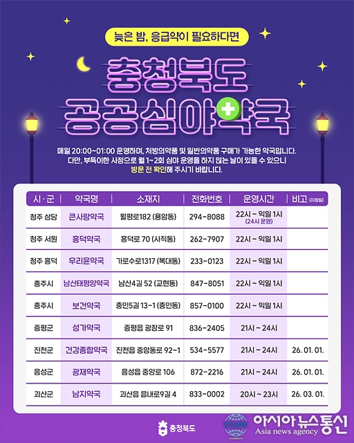 2026년 공공심야약국./사진제공=충북도청 [아시아뉴스통신=장하영 기자] 충청북도는 휴일·심야 시간대 도민의 의약품 구매 불편을 해소하고 의료 공백을 최소화 하기 위해 2026년 공공심야약국을 총 9개소로 확 대 운영한다. ‘공공심야약국’은 약국 문이 닫히는 심야 시간(20시~익일1시)에도 의약품 .. 2026-02-26