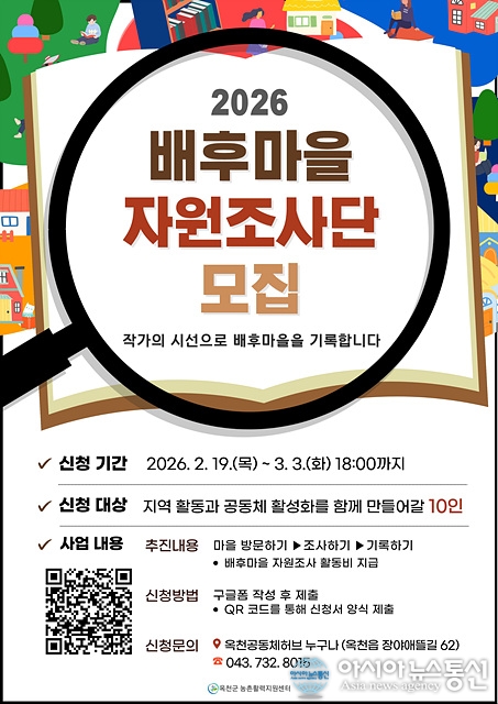 2026 배후마을 자원조사단 모집 포스터./사진제공=옥천군청 [아시아뉴스통신=장하영 기자] 옥천군이 2026년 시군역량강화사업의 일환으로 ‘2026년 배후마을 자원조사’에 참여할 마을과 조사단을 모집한다. ‘2026년 배후마을 자원조사’는 초고령화로 사라져가는 마을의 역사와 자원, 문화, 구술 이.. 2026-02-23