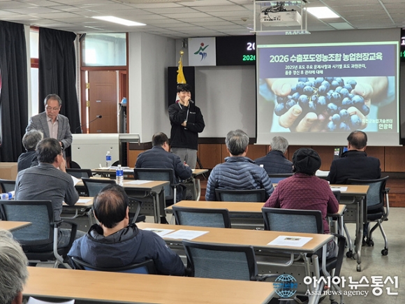 2026 수출포도영농조합 농업현장교육./사진제공=옥천군청 [아시아뉴스통신=장하영 기자] 옥천군농업기술센터(소장 유정용)는 지난 20일 옥천수출포도영농조합법인 회원 30여 명을 대상으로 비가림 포도의 시기별 과원관리와 신규 식재 후 수형관리에 관한 이론 교육을 실시했다고 밝혔다. 이번 교육은 법인 정기.. 2026-02-23