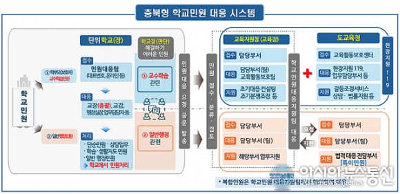 충북형 학교민원 대응 시스템./사진제공=충북교육청 [아시아뉴스통신=장하영 기자] 충청북도교육청(교육감 윤건영)은 새학년 교육과정 준비기간(2.23.~2.25.)에 맞춰 교원의 교육활동 보호를 위한 <2026. 현장 밀착형 ‘곁에서 바로’ 교육활동 보호 시행계획>을 수립하고 각급 학교에 안내했다. 이번 시행.. 2026-02-24