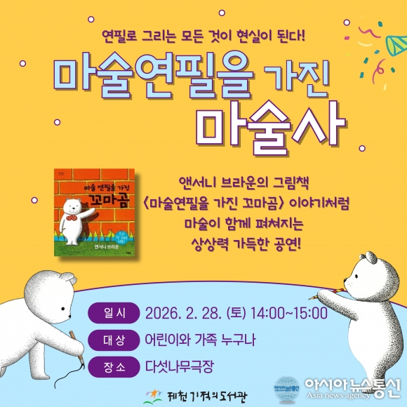 마술 연필을 가진 마술사 홍보물./사진제공=제천시청 [아시아뉴스통신=장하영 기자] 제천기적의도서관(관장 정세나)은 오는 28일 오후 2시, 어린이와 가족을 위한 특별한 마술 공연 <마술 연필을 가진 마술사>를 개최한다. 이번 공연은 전 세계적으로 사랑받는 작가 앤서니 브라운의 그림책 <마술 연필을 .. 2026-02-24