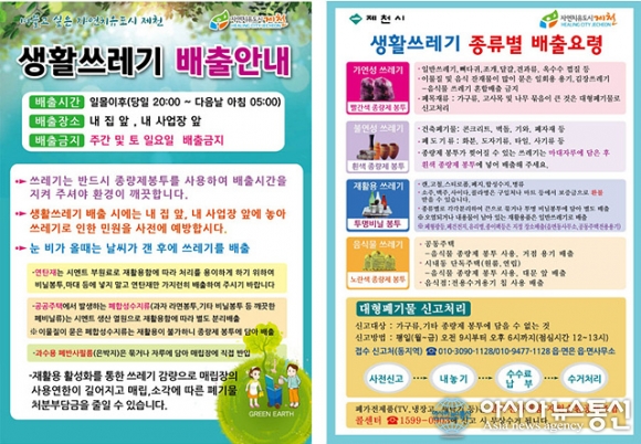 쓰레기, 폐기물 배출 요령 안내./사진제공=제천시청 [아시아뉴스통신=장하영 기자] 제천시는 주민들의 올바른 생활쓰레기 배출과 재활용 활성화를 위해 생활쓰레기와 재활용품, 대형폐기물의 배출 요령을 안내했다. 생활쓰레기 배출 시간은 당일 일몰 이후 오후 8시부터 다음 날 오전 5시까지이며, 배출 장소는.. 2026-02-24