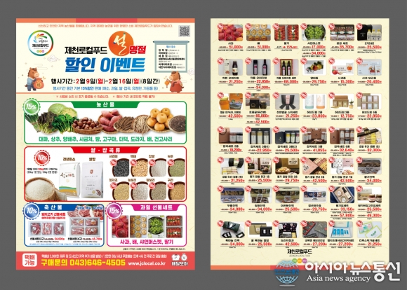 제천로컬푸드, 설맞이 할인행사./사진제공=제천시청 [아시아뉴스통신=장하영 기자] 제천로컬푸드협동조합(조합장 김현주)이 설 명절을 맞아 고물가 시대에 소비자 장바구니 부담을 덜고, 지역 농가 소득을 높이기 위해 특별 할인 행사를 연다. 이번 할인 행사는 2월 9일부터 16일까지 8일간 제천로컬푸드 직매장.. 2026-02-06