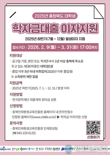 2025년 하반기 학자금대출 이자 지원신청./사진제공=충북도청 [아시아뉴스통신=장하영 기자] 충북인재평생교육진흥원(이하 인평원)은 대학(원)생들의 학자금대출 부담을 줄이기 위해 2025년 하반기 학자금대출 이자 지원신청을 오 는 2월 9일부터 3월 31일까지 접수한다고 밝혔다. 학자금 이자지원사업은 대학(원).. 2026-02-09