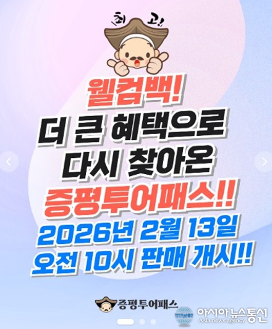 2026년 증평투어패스 홍보물./사진제공=증평군청 [아시아뉴스통신=장하영 기자] 충북 증평군이 설 연휴를 앞두고 통합 관광상품인 증평투어패스 판매를 이달 13일부터 재개한다고 밝혔다. 지난해 관광객들의 높은 호응 속에 조기 마감됐던 이후, 일부 내용을 보완해 다시 선보이는 것이다. 증평투어패스는 지.. 2026-02-09