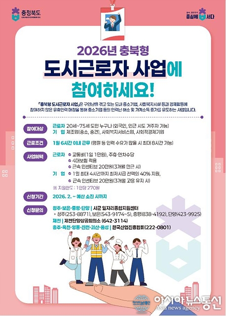 2026년 충북형 도시근로자 지원사업 홍보물./사진제공=충북도청 [아시아뉴스통신=장하영 기자] 충북도가 도내 기업과 소상공인의 구인난 해소와 유휴 인력의 경제 활동 참여를 위한 ‘2026년 충북형 도시근로자 지원사업’을 2월부터 본격 시행한다. 특히 충북도는 올해를 ‘도시근로자 사업 완성의 해&.. 2026-02-03